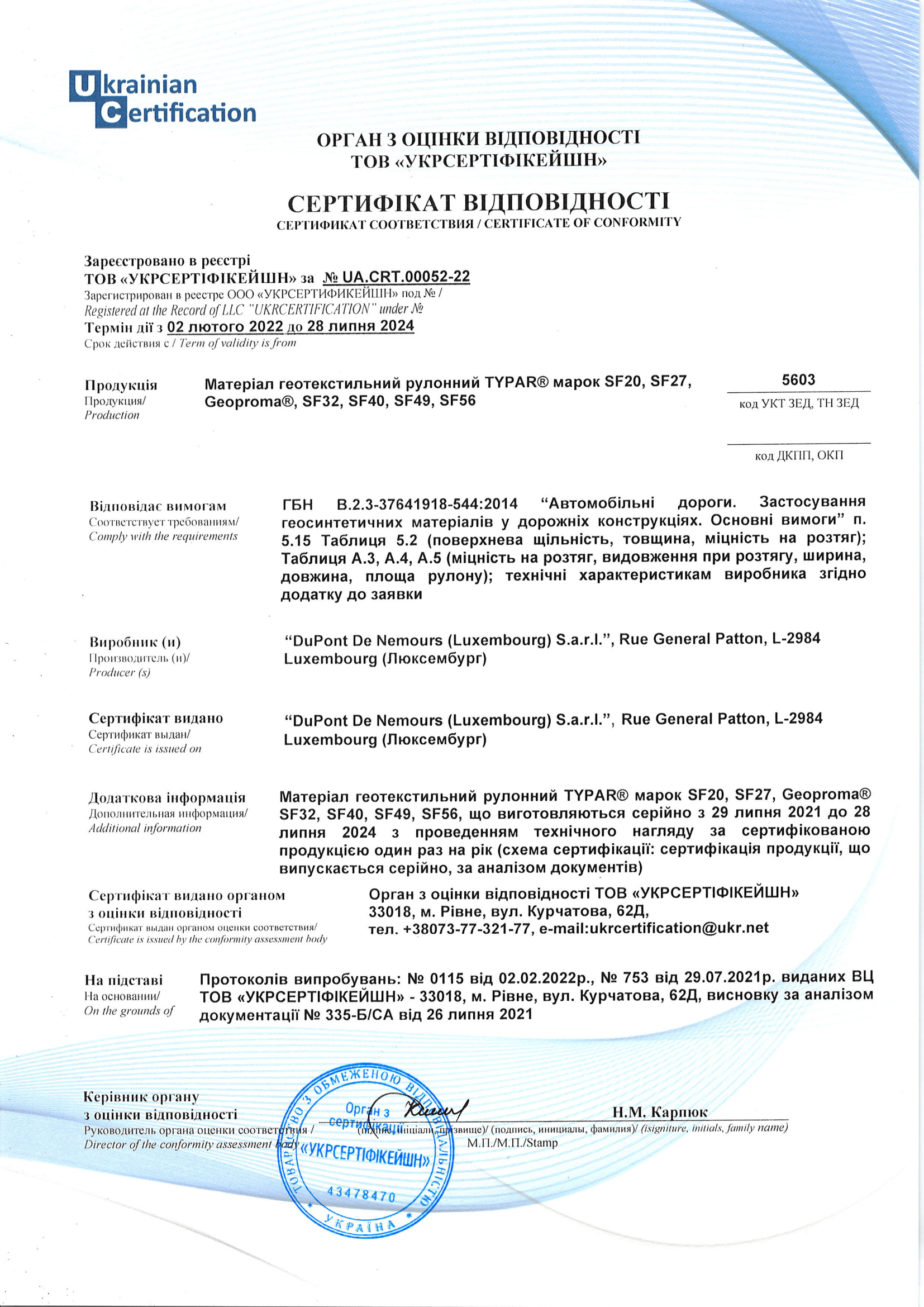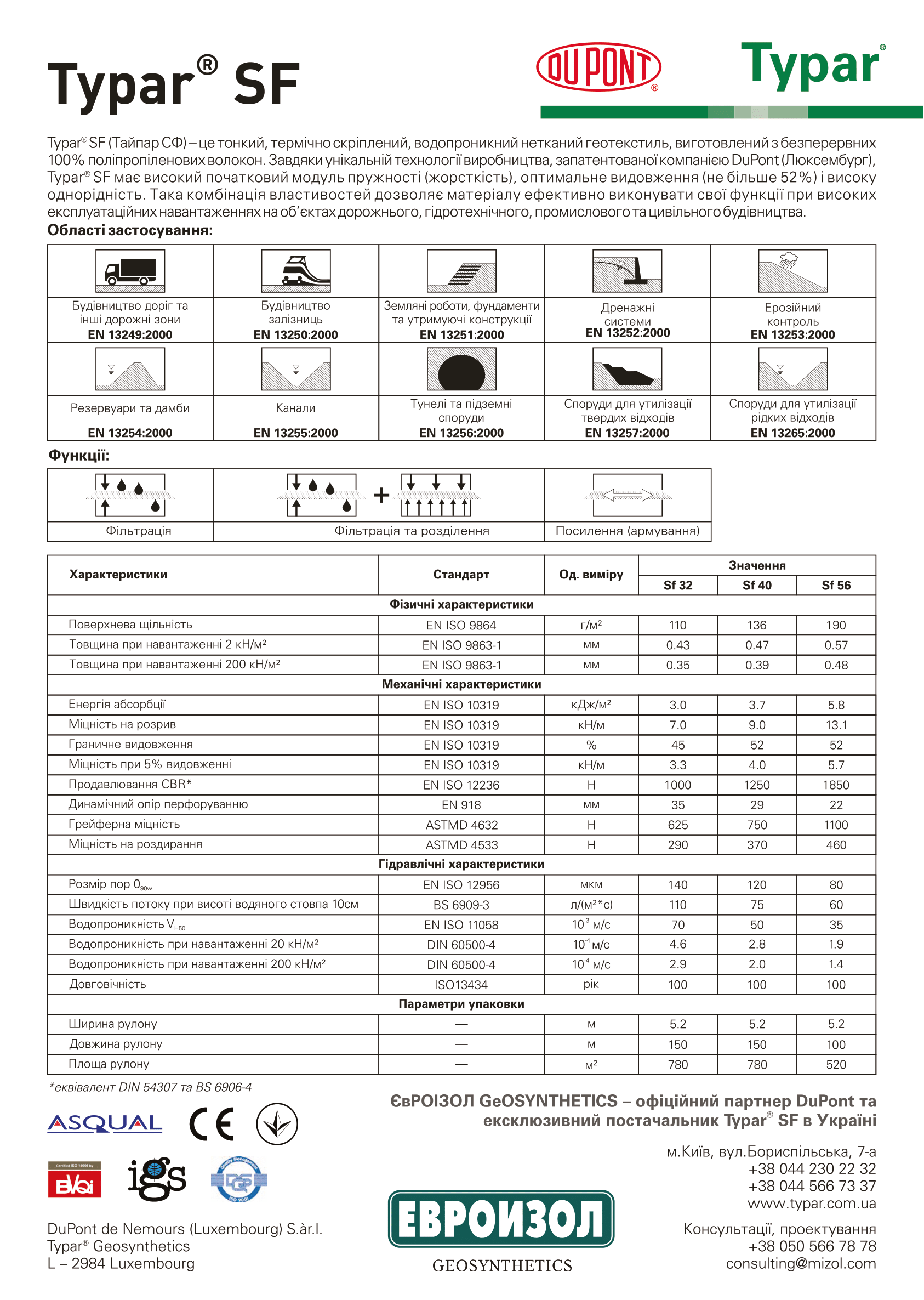 Typar® SF (Тайпар СФ) - це тонкий, термічно скріплений, водопроникний нетканий геотекстиль, виготовлений із безперервних 100% поліпропіленових волокон. Завдяки унікальній технології, запатентованій компанією DuPont™ (Люксембург), Typar® SF має високий початковий модуль пружності (жорсткість), оптимальне подовження (не більше 55%) та високу однорідність.