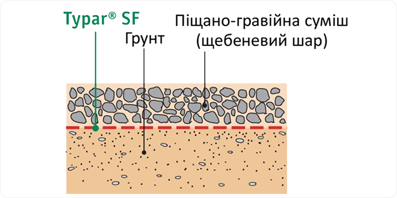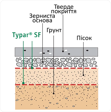 Завдяки своїм унікальним характеристикам геотекстиль Typar SF у дорожніх конструкціях виконує функції зміцнення (стабілізації), поділу різнофракційних матеріалів, а також слугує фільтром у дренажних конструкціях. При поділі Typar SF запобігає вдавленню зернистого шару дорожнього покриття в шар основи, а також запобігає його забрудненню нижнім шаром. Другий випадок актуальний, коли зернистий або щебенистий шари укладаються безпосередньо на ґрунтову основу.