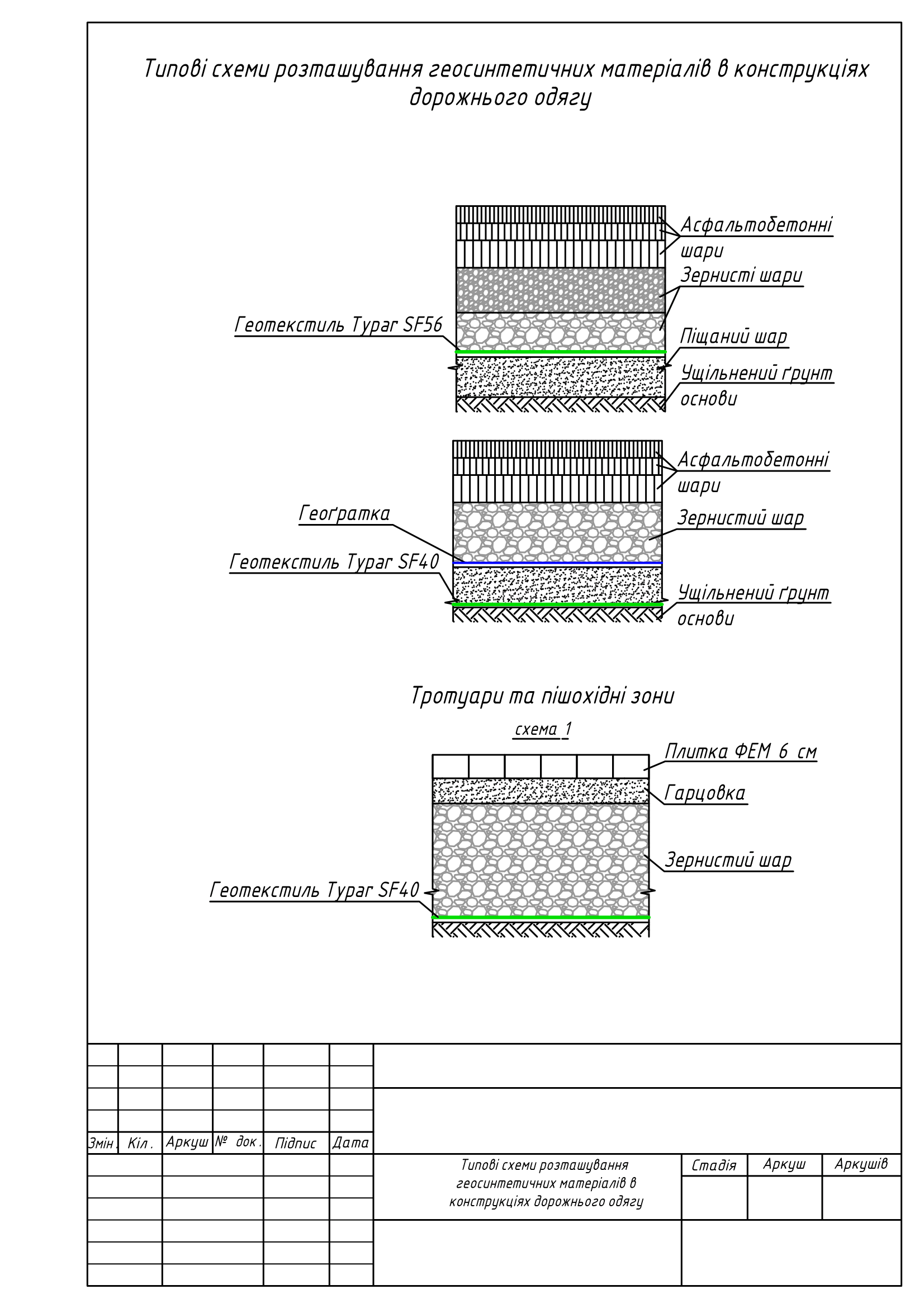| Функції, що виконує геотекстиль | Характеристики, необхідні для підбору та оцінки геотекстилю | Методика випробувань | Рекомендований тип та марка геотекстилю | Характеристики рекомендованого геотекстилю |